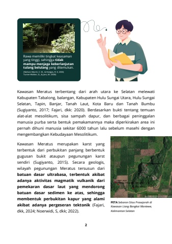 Kawasan Meratus terbentang dari arah utara ke Selatan melewatiKabupaten Tabalong, balangan, Kabupaten Hulu Sungai Utara, Hulu SungaiSelatan, Tapin, Banjar, Tanah Laut, Kota Baru dan Tanah Bumbu(Sugiyanto, 2017; Fajari, dkk: 2020). Berdasarkan bukti tentang temuanalat-alat mesolitikum, sisa sampah dapur, dan berbagai peninggalanmanusia purba serta bentuk pemakamannya maka diperkirakan area inipernah dihuni manusia sekitar 6000 tahun lalu sebelum masehi denganmengembangkan Kebudayaan Mesolitikum.Kawasan Meratus merupakan karst yangterbentuk dari perbukitan panjang berbentukgugusan bukit ataupun pegunungan karstsendiri (Sugiyanto, 2015). Secara geologis,wilayah pegunungan Meratus tersusun daribatuan dasar ultrabasa, terbentuk akibatadanya aktivitas magmatik vulkanik daripemekaran dasar laut yang mendorongbatuan dasar sedimen ke atas, sehinggamembentuk perbukitan kapur yang alamiakibat adanya pergeseran tektonik (Fajari,dkk, 2024; Noerwidi, S, dkk; 2022).Rawa memiliki tingkat keasamanyang tinggi, sehingga tidakmampu menjaga keberlanjutantulang belulang yang ditemukan.(Nielsen-Marsh, C. M., & Hedges, R. E, 2000;Turner-Walker, G., & Jans, M. 2008)2PETA Sebaran Situs Prasejarah diKawasan Liang Bangkai Mantewe,Kalimantan Selatan