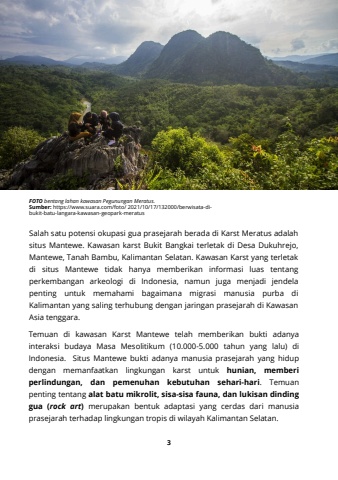 Salah satu potensi okupasi gua prasejarah berada di Karst Meratus adalahsitus Mantewe. Kawasan karst Bukit Bangkai terletak di Desa Dukuhrejo,Mantewe, Tanah Bambu, Kalimantan Selatan. Kawasan Karst yang terletakdi situs Mantewe tidak hanya memberikan informasi luas tentangperkembangan arkeologi di Indonesia, namun juga menjadi jendelapenting untuk memahami bagaimana migrasi manusia purba diKalimantan yang saling terhubung dengan jaringan prasejarah di KawasanAsia tenggara.3FOTO bentang lahan kawasan Pegunungan Meratus.Sumber: https://www.suara.com/foto/ 2021/10/17/132000/berwisata-dibukit-batu-langara-kawasan-geopark-meratusTemuan di kawasan Karst Mantewe telah memberikan bukti adanyainteraksi budaya Masa Mesolitikum (10.000-5.000 tahun yang lalu) diIndonesia. Situs Mantewe bukti adanya manusia prasejarah yang hidupdengan memanfaatkan lingkungan karst untuk hunian, memberiperlindungan, dan pemenuhan kebutuhan sehari-hari. Temuanpenting tentang alat batu mikrolit, sisa-sisa fauna, dan lukisan dindinggua (rock art) merupakan bentuk adaptasi yang cerdas dari manusiaprasejarah terhadap lingkungan tropis di wilayah Kalimantan Selatan.