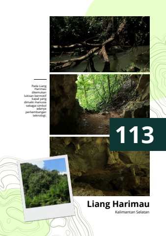 Liang HarimauKalimantan Selatan113Pada LiangHarimauditemukanlukisan bermotifkapal yangdimaiki manusiasebagai simboladanyaperkembanganteknologi.