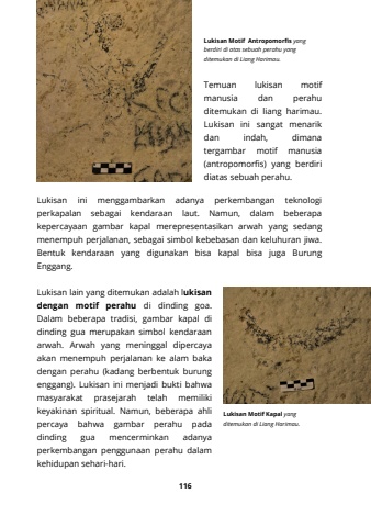 116Lukisan ini menggambarkan adanya perkembangan teknologiperkapalan sebagai kendaraan laut. Namun, dalam beberapakepercayaan gambar kapal merepresentasikan arwah yang sedangmenempuh perjalanan, sebagai simbol kebebasan dan keluhuran jiwa.Bentuk kendaraan yang digunakan bisa kapal bisa juga BurungEnggang.Lukisan lain yang ditemukan adalah lukisandengan motif perahu di dinding goa.Dalam beberapa tradisi, gambar kapal didinding gua merupakan simbol kendaraanarwah. Arwah yang meninggal dipercayaakan menempuh perjalanan ke alam bakadengan perahu (kadang berbentuk burungenggang). Lukisan ini menjadi bukti bahwamasyarakat prasejarah telah memilikikeyakinan spiritual. Namun, beberapa ahlipercaya bahwa gambar perahu padadinding gua mencerminkan adanyaperkembangan penggunaan perahu dalamkehidupan sehari-hari.Lukisan Motif Antropomorfis yangberdiri di atas sebuah perahu yangditemukan di Liang Harimau.Lukisan Motif Kapal yangditemukan di Liang Harimau.Temuan lukisan motifmanusia dan perahuditemukan di liang harimau.Lukisan ini sangat menarikdan indah, dimanatergambar motif manusia(antropomorfis) yang berdiridiatas sebuah perahu.