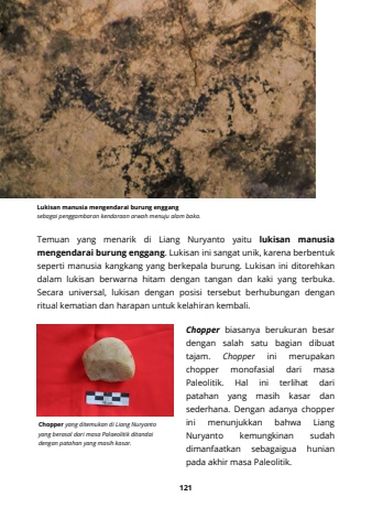 121Temuan yang menarik di Liang Nuryanto yaitu lukisan manusiamengendarai burung enggang. Lukisan ini sangat unik, karena berbentukseperti manusia kangkang yang berkepala burung. Lukisan ini ditorehkandalam lukisan berwarna hitam dengan tangan dan kaki yang terbuka.Secara universal, lukisan dengan posisi tersebut berhubungan denganritual kematian dan harapan untuk kelahiran kembali.Chopper biasanya berukuran besardengan salah satu bagian dibuattajam. Chopper ini merupakanchopper monofasial dari masaPaleolitik. Hal ini terlihat daripatahan yang masih kasar dansederhana. Dengan adanya chopperini menunjukkan bahwa LiangNuryanto kemungkinan sudahdimanfaatkan sebagaigua hunianpada akhir masa Paleolitik.Lukisan manusia mengendarai burung enggangsebagai penggambaran kendaraan arwah menuju alam baka.Chopper yang ditemukan di Liang Nuryantoyang berasal dari masa Palaeolitik ditandaidengan patahan yang masih kasar.