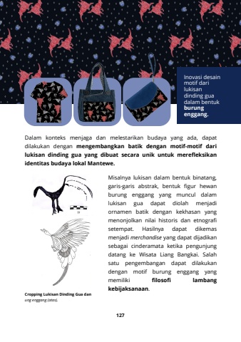 Inovasi desainmotif darilukisandinding guadalam bentukburungenggang.127Dalam konteks menjaga dan melestarikan budaya yang ada, dapatdilakukan dengan mengembangkan batik dengan motif-motif darilukisan dinding gua yang dibuat secara unik untuk merefleksikanidentitas budaya lokal Mantewe.Cropping Lukisan Dinding Gua danung enggang (atas).Misalnya lukisan dalam bentuk binatang,garis-garis abstrak, bentuk figur hewanburung enggang yang muncul dalamlukisan gua dapat diolah menjadiornamen batik dengan kekhasan yangmenonjolkan nilai historis dan etnografisetempat. Hasilnya dapat dikemasmenjadi merchandise yang dapat dijadikansebagai cinderamata ketika pengunjungdatang ke Wisata Liang Bangkai. Salahsatu pengembangan dapat dilakukandengan motif burung enggang yangmemiliki filosofi lambangkebijaksanaan.