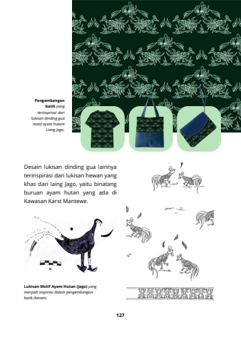 127Desain lukisan dinding gua lainnyaterinspirasi dari lukisan hewan yangkhas dari laing Jago, yaitu binatangburuan ayam hutan yang ada diKawasan Karst Mantewe.Pengembanganbatik yangterinspirasi darilukisan dinding guamotif ayam hutamLiang Jago.Lukisan Motif Ayam Hutan (Jago) yangmenjadi inspirasi dalam pengembanganbatik (kanan).