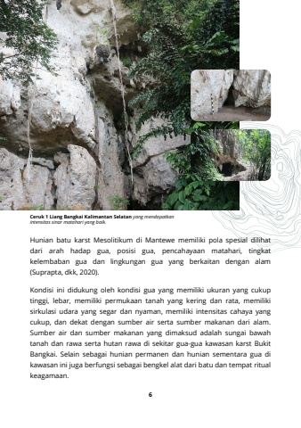 6Hunian batu karst Mesolitikum di Mantewe memiliki pola spesial dilihatdari arah hadap gua, posisi gua, pencahayaan matahari, tingkatkelembaban gua dan lingkungan gua yang berkaitan dengan alam(Suprapta, dkk, 2020).Kondisi ini didukung oleh kondisi gua yang memiliki ukuran yang cukuptinggi, lebar, memiliki permukaan tanah yang kering dan rata, memilikisirkulasi udara yang segar dan nyaman, memiliki intensitas cahaya yangcukup, dan dekat dengan sumber air serta sumber makanan dari alam.Sumber air dan sumber makanan yang dimaksud adalah sungai bawahtanah dan rawa serta hutan rawa di sekitar gua-gua kawasan karst BukitBangkai. Selain sebagai hunian permanen dan hunian sementara gua dikawasan ini juga berfungsi sebagai bengkel alat dari batu dan tempat ritualkeagamaan.Ceruk 1 Liang Bangkai Kalimantan Selatan yang mendapatkanintensitas sinar matahari yang baik.