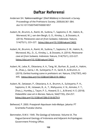 132Andersen SH. %u2018K%u00f8kkenm%u00f8ddinger%u2019 (Shell Middens) in Denmark: a Survey. Proceedings of the Prehistoric Society. 2000;66:361-384. doi:10.1017/S0079497X00001857Aubert, M., Brumm, A., Ramli, M., Sutikna, T., Saptomo, E. W., Hakim, B., Morwood, M. J, van den Bergh, G. D., Kinsley, L., & Dosseto, A. (2014). Pleistocene cave art from Sulawesi, Indonesia. Nature, 514(7521), 223%u2013227. https://doi.org/10.1038/nature13422Aubert, M., Brumm, A., Ramli, M., Sutikna, T., Saptomo, E. W., Hakim, B., Morwood, M.J., D., G., Kinsley, L., & Dosseto, A. (2014). Pleistocene cave art from Sulawesi, Indonesia. Nature, 514(7521), 223-227. https://doi.org/10.1038/nature13422Aubert, M., Lebe, R., Oktaviana, A. A., Tang, M., Burhan, B., Jusdi, A., Hakim, B., Zhao, J., Geria, I. M., Sulistyarto, P. H., Sardi, R., & Brumm, A. (2019). Earliest hunting scene in prehistoric art. Nature, 576(7787), 442- 445. https://doi.org/10.1038/s41586-019-1806-yAubert, M., Setiawan, P., Oktaviana, A. A., Brumm, A., Sulistyarto, P. H., Saptomo, E. W., Istiawan, B., A., T., Wahyuono, V. N., Atmoko, F. T., Zhao, J., Huntley, J., Ta%u00e7on, P. S., Howard, D. L., & Brand, H. E. (2018). Palaeolithic cave art in Borneo. Nature, 564(7735), 254-257. https://doi.org/10.1038/s41586-018-0679-9Bellwood, P. 2000. Prasejarah Kepulauan Indo-Malaya. Jakarta: PT Gramedia Pustaka Utama.Bemmelen, R.W.V. 1949. The Geology of Indonesia. Volume IA. The Hague:General Geology of Indonesia and Adjacent Archipelagoes Government Printing Office. Daftar Referensi