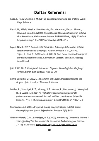134Fage, L.-H., & Chazine, J.-M. (2010). Born%u00e9o: La m%u00e9moire des grottes. Lyon: Fage %u00e9ditions.Fajari, N., Alifah, Wasita, Ulce Oktrivia, Eko Herwanto, Fatom Ahmad, %u2026 Reynaldi Saputra. (2024). Jejak Okupasi Manusia Prasejarah di Situs Gua Batu Baras, Kalimantan Selatan. PURBAWIDYA, 13(2), 229%u2013249. https://doi.org/10.55981/purbawidya.2024.6016Fajari, N.M.E. 2017. Karakteristik Situs-Situs Arkeologi Kalimantan Selatan Berdasarkan Lokasi Geografis. Naditiria Widya. 11(1), 61-79. Fajari, R., Sari, P., & Widodo, A. (2018). Gua Batu: Hunian Prasejarah di Pegunungan Meratus, Kalimantan Selatan. Berkala Arkeologi Kemdikbud.Jati, S.S.P. 2013. Prasejarah Indonesia: Tinjauan Kronologi dan Morfologi. Jurnal Sejarah dan Budaya. 7(2), 20-30.Lewis-Williams, D. (2002). The Mind in the Cave: Consciousness and the Origins of Art. London: Thames & Hudson.M%u00fcller, P., Staudigel, P. T., Murray, S. T., Vernet, R., Barusseau, J., Westphal, H., & Swart, P. K. (2017). Prehistoric cooking versus accurate palaeotemperature records in shell midden constituents. Scientific Reports, 7(1), 1-11. https://doi.org/10.1038/s41598-017-03715-8Munandar, A.A. 2013. Artefak di Ruang Geografi: Kajian Artefak dalam Geografi Sejarah. Jurnal Sejarah dan Budaya, 7(2), 8-15.Nielsen-Marsh, C. M., & Hedges, R. E. (2000). Patterns of Diagenesis in Bone I : The Effects of Site Environments. Journal of Archaeological Science, 27(12), 1139-1150. https://doi.org/10.1006/jasc.1999.0537.Daftar Referensi