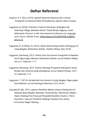 136Soejono, R. P. (Ed.). (2010). Sejarah Nasional Indonesia Jilid I: Zaman Prasejarah di Indonesia (Edisi Pemutakhiran). Jakarta: Balai Pustaka.Sugiyanto, B. (2024). Prehistoric Cultural Characters of Bangkai Hill, Dukuhrejo Village, Mantewe District, Tanah Bumbu Regency, South Kalimantan Province. In 4th International Conference on Language and Culture. Atlantis Press. https://doi.org/10.2991/978-2-38476- 251-4_14.Sugiyanto, B., & Widya, N. (2014). Kajian awal tentang lukisan dinding gua di Liang Bangkai, Kalimantan Selatan. Naditira Widya, 8(2), 59-68Sugiyanto, Bambang. 2013. Potensi Situs Gua Hunian Prasejarah di Kawasan Karst Pegunungan Meratus, Kalimantan Selatan. Jurnal Naditira Widya. Vol.2 (1). Halaman 1-11.Sugiyanto, Bambang. 2015. Potensi Arkeologi Prasejarah Kabupaten Tanah Bumbu dan Ancaman yang dihadapinya. Jurnal Naditira Widya. Vol 9 (1). Halaman 1-14Sugiyanto, T. (2013). Karakteristik Gua Hunian di Liang Bangkai, Pegunungan Karst Meratus. Jurnal Arkeologi Indonesia, 31(1), 44-54.Suprapta B, dkk. 2019. Laporan Penelitian Makna Lukisan Dinding Dua Di Kawasan Bukit Bangkai, Mentewe, Tanah Bumbu, Kalimantan Selatan: Kajian Arkeologi Pos-Prosesual-Perspektif Seniotika Charles S. Pierce. Unpublish. Laporan Penelitian Malang: Fakultas Ilmu Sosial, Universitas Negeri Malang.Daftar Referensi