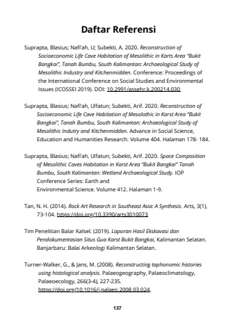137Suprapta, Blasius; Nafi%u2019ah, U; Subekti, A. 2020. Reconstruction of Socioeconomic Life Cave Habitation of Mesolithic in Karts Area %u201cBukit Bangkai%u201d, Tanah Bumbu, South Kalimantan: Archaeological Study of Mesolithic Industry and Kitchenmidden. Conference: Proceedings of the International Conference on Social Studies and Environmental Issues (ICOSSEI 2019). DOI: 10.2991/assehr.k.200214.030Suprapta, Blasius; Nafi%u2019ah, Ulfatun; Subekti, Arif. 2020. Reconstruction of Socioeconomic Life Cave Habitation of Mesolothic in Karst Area %u201cBukit Bangkai%u201d, Tanah Bumbu, South Kalimantan: Archaeological Study of Mesolithic Indutry and Kitchenmidden. Advance in Social Science, Education and Humanities Research. Volume 404. Halaman 178- 184.Suprapta, Blasius; Nafi%u2019ah, Ulfatun; Subekti, Arif. 2020. Space Composition of Mesolithic Caves Habitation in Karst Area %u201cBukit Bangkai%u201d Tanah Bumbu, South Kalimantan: Wetland Archaeological Study. IOP Conference Series: Earth and Environmental Science. Volume 412. Halaman 1-9.Tan, N. H. (2014). Rock Art Research in Southeast Asia: A Synthesis. Arts, 3(1), 73-104. https://doi.org/10.3390/arts3010073Tim Penelitian Balar Kalsel. (2019). Laporan Hasil Ekskavasi dan Pendokumentasian Situs Gua Karst Bukit Bangkai, Kalimantan Selatan. Banjarbaru: Balai Arkeologi Kalimantan Selatan.Turner-Walker, G., & Jans, M. (2008). Reconstructing taphonomic histories using histological analysis. Palaeogeography, Palaeoclimatology, Palaeoecology, 266(3-4), 227-235. https://doi.org/10.1016/j.palaeo.2008.03.024.Daftar Referensi