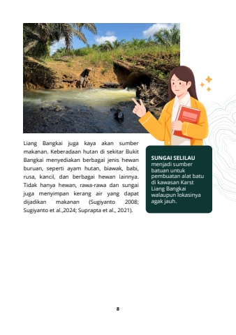 8Liang Bangkai juga kaya akan sumbermakanan. Keberadaan hutan di sekitar BukitBangkai menyediakan berbagai jenis hewanburuan, seperti ayam hutan, biawak, babi,rusa, kancil, dan berbagai hewan lainnya.Tidak hanya hewan, rawa-rawa dan sungaijuga menyimpan kerang air yang dapatdijadikan makanan (Sugiyanto 2008;Sugiyanto et al.,2024; Suprapta et al., 2021).SUNGAI SELILAUmenjadi sumberbatuan untukpembuatan alat batudi kawasan KarstLiang Bangkaiwalaupun lokasinyaagak jauh.