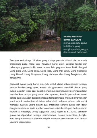 KAWASAN KARSTBUKIT BANGKAImerupakan satu gugusbukit karst yangmenyimpan banyak guadan ceruk di dalamnya.16Terdapat setidaknya 22 situs yang diduga pernah dihuni oleh manusiaprasejarah pada masa lalu. Kawasan karst Bukit Bangkai terdiri daribeberapa gugusan bukit karst, antara lain gugusan karst Bukit Bangkai,Liang Batu Ukir, Liang Susu, Liang Jago, Liang Pak Sutat, Liang Suprapta,Liang Hanafi, Liang Nuryanto, Liang Harimau, dan Liang Tengkorak, danliang Sawit.Terdapat syarat yang harus dipenuhi untuk dapat dikategorikan sebagaitempat hunian yang layak, antara lain gua/ceruk memiliki ukuran yangcukup luas dan lebar agar dapat menampung penghuninya sehingga dapatmemberikan tempat yang aman dan nyaman, kondisi permukaan tanahkering dan rata agar dapat membuat tempat tinggal menjadi nyaman danstabil untuk melakukan aktivitas sehari-hari, sirkulasi udara baik untukmenjaga kualitas udara dalam gua, intensitas cahaya cukup dan dekatdengan sumber air serta sumber makanan untuk kehidupan berkelanjutan(Nurani & Hascaryo, 2015; Sugiyanto, 2013; Fajari et al., 2018). Sebagiangua/ceruk digunakan sebagai permukiman, hunian sementara, bengkelatau tempat membuat alat-alat serpih, maupun pemakaman atau tempatupacara keagamaan.