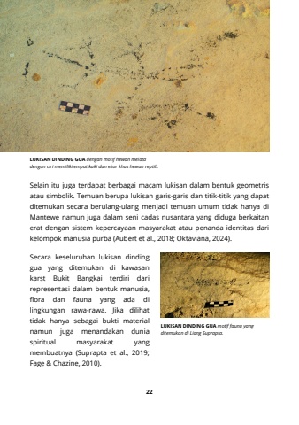 22Selain itu juga terdapat berbagai macam lukisan dalam bentuk geometrisatau simbolik. Temuan berupa lukisan garis-garis dan titik-titik yang dapatditemukan secara berulang-ulang menjadi temuan umum tidak hanya diMantewe namun juga dalam seni cadas nusantara yang diduga berkaitanerat dengan sistem kepercayaan masyarakat atau penanda identitas darikelompok manusia purba (Aubert et al., 2018; Oktaviana, 2024).LUKISAN DINDING GUA motif fauna yangditemukan di Liang Suprapta.Secara keseluruhan lukisan dindinggua yang ditemukan di kawasankarst Bukit Bangkai terdiri darirepresentasi dalam bentuk manusia,flora dan fauna yang ada dilingkungan rawa-rawa. Jika dilihattidak hanya sebagai bukti materialnamun juga menandakan duniaspiritual masyarakat yangmembuatnya (Suprapta et al., 2019;Fage & Chazine, 2010).LUKISAN DINDING GUA dengan motif hewan melatadengan ciri memiliki empat kaki dan ekor khas hewan reptil..