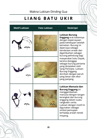 Motif Lukisan Foto Lukisan Deskripsi25Lukisan BurungEnggang erat kaitannyadengan kepercayaanpada kehidupan setelahkematian. Burung inidipercaya sebagaikendaraan arwah dandigambarkan sebagaiburung pelindung bagimasyarakat Suku Dayak,karena dianggapsebagai burung pertamayang diciptakan olehSang Pencipta. LukisanBurung Enggangdicirikan dengan paruhyang besar dan ekoryang panjang.Makna Lukisan Dinding GuaL I A N G B A T U U K I RLukisan Manusia danBurung Enggang inimenggambarkanmanusia dengan tanganterangkat dan burungenggang dalam suaturangkaian cerita.Lukisan dengan motif inidigunakan sebagaisimbol pemujaanterhadap arwah nenekmoyang.