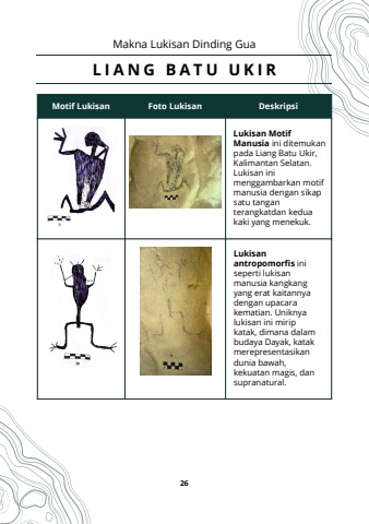 Motif Lukisan Foto Lukisan Deskripsi26Makna Lukisan Dinding GuaL I A N G B A T U U K I RLukisan MotifManusia ini ditemukanpada Liang Batu Ukir,Kalimantan Selatan.Lukisan inimenggambarkan motifmanusia dengan sikapsatu tanganterangkatdan keduakaki yang menekuk.Lukisanantropomorfis iniseperti lukisanmanusia kangkangyang erat kaitannyadengan upacarakematian. Uniknyalukisan ini miripkatak, dimana dalambudaya Dayak, katakmerepresentasikandunia bawah,kekuatan magis, dansupranatural.