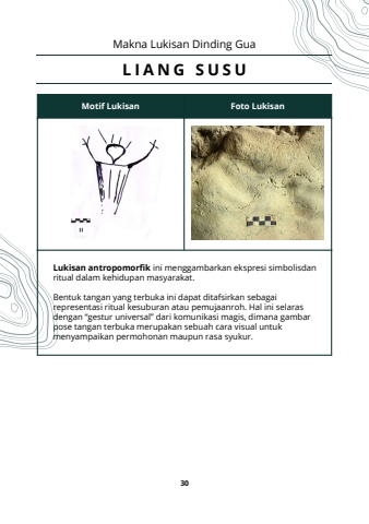 Motif Lukisan Foto Lukisan30Makna Lukisan Dinding GuaL I A N G S U S ULukisan antropomorfik ini menggambarkan ekspresi simbolisdanritual dalam kehidupan masyarakat.Bentuk tangan yang terbuka ini dapat ditafsirkan sebagairepresentasi ritual kesuburan atau pemujaanroh. Hal ini selarasdengan %u201cgestur universal%u201d dari komunikasi magis, dimana gambarpose tangan terbuka merupakan sebuah cara visual untukmenyampaikan permohonan maupun rasa syukur.