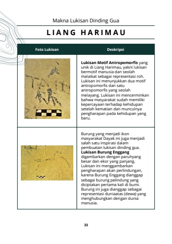 Foto Lukisan Deskripsi33Lukisan Motif Antropomorfis yangunik di Liang Harimau, yakni lukisanbermotif manusia dan seolahmalaikat sebagai representasi roh.Lukisan ini menunjukkan dua motifantropomorfis dan satuantropomorfis yang seolahmelayang. Lukisan ini mencerminkanbahwa masyarakat sudah memilikikepercayaan terhadap kehidupansetelah kematian dan munculnyapengharapan pada kehidupan yangbaru.Makna Lukisan Dinding GuaL I A N G H A R I M A UBurung yang menjadi ikonmasyarakat Dayak ini juga menjadisalah satu inspirasi dalampembuatan lukisan dinding gua.Lukisan Burung Enggangdigambarkan dengan paruhyangbesar dan ekor yang panjang.Lukisan ini menggambarkanpengharapan akan perlindungan,karena Burung Enggang dianggapsebagai burung pelindung yangdiciptakan pertama kali di bumi.Burung ini juga dianggap sebagairepresentasi duniaatas (dewa) yangmenghubungkan dengan duniamanusia.