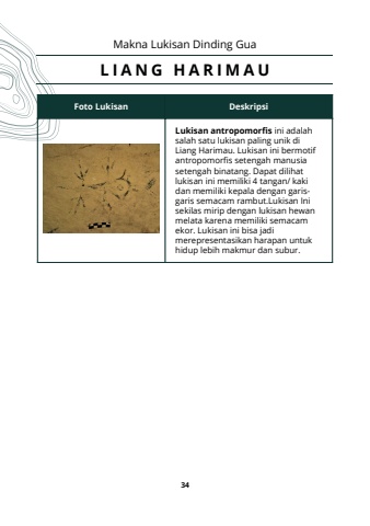 Foto Lukisan Deskripsi34Makna Lukisan Dinding GuaL I A N G H A R I M A ULukisan antropomorfis ini adalahsalah satu lukisan paling unik diLiang Harimau. Lukisan ini bermotifantropomorfis setengah manusiasetengah binatang. Dapat dilihatlukisan ini memiliki 4 tangan/ kakidan memiliki kepala dengan garisgaris semacam rambut.Lukisan Inisekilas mirip dengan lukisan hewanmelata karena memiliki semacamekor. Lukisan ini bisa jadimerepresentasikan harapan untukhidup lebih makmur dan subur.