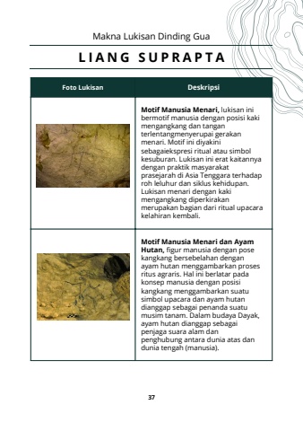 Foto Lukisan Deskripsi37Motif Manusia Menari, lukisan inibermotif manusia dengan posisi kakimengangkang dan tanganterlentangmenyerupai gerakanmenari. Motif ini diyakinisebagaiekspresi ritual atau simbolkesuburan. Lukisan ini erat kaitannyadengan praktik masyarakatprasejarah di Asia Tenggara terhadaproh leluhur dan siklus kehidupan.Lukisan menari dengan kakimengangkang diperkirakanmerupakan bagian dari ritual upacarakelahiran kembali.Makna Lukisan Dinding GuaL I A N G S U P R A P T AMotif Manusia Menari dan AyamHutan, figur manusia dengan posekangkang bersebelahan denganayam hutan menggambarkan prosesritus agraris. Hal ini berlatar padakonsep manusia dengan posisikangkang menggambarkan suatusimbol upacara dan ayam hutandianggap sebagai penanda suatumusim tanam. Dalam budaya Dayak,ayam hutan dianggap sebagaipenjaga suara alam danpenghubung antara dunia atas dandunia tengah (manusia).