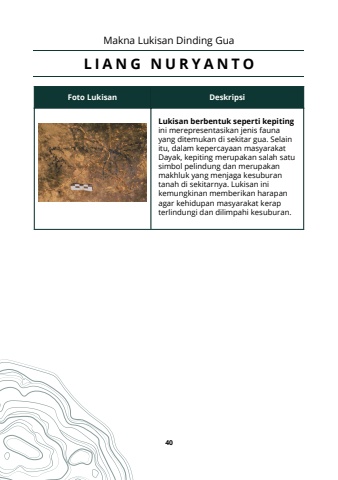 Foto Lukisan Deskripsi40Makna Lukisan Dinding GuaL I A N G N U R Y A N T OLukisan berbentuk seperti kepitingini merepresentasikan jenis faunayang ditemukan di sekitar gua. Selainitu, dalam kepercayaan masyarakatDayak, kepiting merupakan salah satusimbol pelindung dan merupakanmakhluk yang menjaga kesuburantanah di sekitarnya. Lukisan inikemungkinan memberikan harapanagar kehidupan masyarakat kerapterlindungi dan dilimpahi kesuburan.