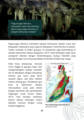 %u201cPegunungan Meratusmerupakan salah satu bentanglahan yang sangat dominan diwilayah Kalimantan Selatan%u201d50Pegunungan Meratus membelah wilayah Kalimantan Selatan mulai dariKabupaten Tabalong di utara sapai ke Kabupaten Tanah Bumbu di selatan.Tradisi menetap di dalam gua-gua ini tampaknya juga berkembang diwilayah Kalimantan Selatan (Sugiyanto, 2017). Awal kehidupan pada masaprasejarah ditandai dengan berkembangnya budaya Paleolitik yangditandai dengan munculnya peradaban di lembah-lembah tepi sungai.Peta Geologi Pegunungan Meratus diKalimantan Selatan.Pada masa selanjutnya, manusiamulai tinggal di gua-gua kapur danmengembangkan budaya mesolitik.Hal ini dibuktikan dengan banyaknyatemuan gua karst yang berisisampah dapur, alat batu, bahkanlukisan dinding gua. Persebaran guakarst di Kalimantan Selatanmenunjukkan suatu pola terkaitdengan pemilihan dan pemanfaatanlingkungan untuk hunian (Fajari,2017). Pola tersebut terbentukkarena adanya hubungan antaraaktivitas manusia dengan ruangtempat tinggalnya.