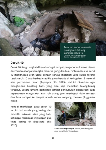 Ceruk 10 liang bangkai dikenal sebagai tempat penguburan karena disanaditemukan adanya kerangka manusia yang dikubur. Pintu masuk ke ceruk10 menghadap arah utara dengan cahaya matahari yang cukup terang.Letak ceruk 10 juga berbeda sedikit, yaitu berada di ketinggian 15 meter diatas permukaan tanah (Suprapta dkk: 2019). Hal ini dilakukan agarmenghindari binatang buas yang bisa saja memakan tulang-tulangtersebut. Secara umum, pemilihan tempat penguburan didasarkan padakepercayaan masyarakat agar roh orang yang meninggal tidak tersesatdan bisa sampai ke tempat arwah nenek moyang mereka (Sugiyanto,2009).58Ceruk 10Temuan Kubur manusiaprasejarah di LiangBangkai ceruk 10(Sumber: Laporan PenelitianBlasius Suprapta dkk, 2019Kondisi morfologis pada ceruk 10terdiri dari tanah yang kering danmemiliki sirkulasi udara yang baik,sehingga membuat lingkungan guatetap kering. tik (Suprapta dkk:2020).Ceruk 10 Liang Bangkai berada pada ketinggianguna menghindari hewan buas.