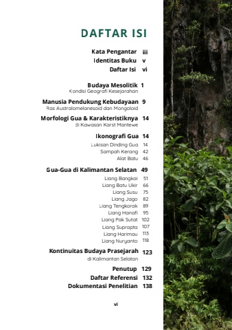 Kata Pengantar iii DAFTAR ISI Identitas Buku v Budaya Mesolitik 1 Kondisi Geografi Kesejarahan Manusia Pendukung Kebudayaan 9 Ras Australomelanesoid dan Mongoloid Morfologi Gua & Karakteristiknya 14 di Kawasan Karst Mantewe Ikonografi Gua Lukisan Dinding Gua Sampah Kerang Alat Batu Gua-Gua di Kalimantan Selatan 49 Liang Bangkai Liang Batu Ukir Liang Susu Liang Jago Liang Tengkorak Liang Hanafi Liang Pak Sutat Liang Suprapta Liang Harimau Liang Nuryanto Kontinuitas Budaya Prasejarah 123 di Kalimantan Selatan Penutup 129 51 6675828995 102 107 113 118144246 vi Daftar Isi vi 14 Daftar Referensi 132 Dokumentasi Penelitian 138