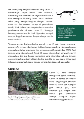 62Hal inilah yang menjadi kelebihan liang ceruk 12diantaranya dapat dihuni oleh manusia,melindungi manusia dari berbagai macam cuacadan serangan binatang buas, serta terdapatsekat yang menghubungkan dengan sumbermata air. Berdasarkan survey di permukaantanah, tidak didapatkan sampah dapur atau sisapembuatan alat di area ceruk 12. Sehinggakemungkinan tempat ini tidak digunakan sebagaitempat tinggal sementara, hanya sebagai mediauntuk melukis.Ceruk 13Ceruk 11 Liang Bangkai mulut gua sedikit tertutupsehingga matahari hanya menyinari mulut gua. .Di ceruk 12 Ditemukanlukisan berbentukhewan melata yangdipercaya sebagaisimbol kesuburan dankemakmuran.Ceruk 13 liang bangkaimerupakan ceruk istimewa.Ceruk 13 berada di sebelahutara Liang Bangkai. Strukturceruk 13 terdiri dari ruangangua, mulut gua, danhalaman gua. Bagian luarmulut gua ditemukanadanya sampah dapurberupa kerang gastropoda.Temuan penting lukisan dinding gua di ceruk 12 yaitu burung enggang,antromorfis, topeng, dan buaya. Lukisan buaya tergolong istimewa karenamerupakan simbol kesuburan dan kemakmuran (Suprapta dkk: 2019). Daritemuan yang ditemukan di Ceruk 12, dapat disimpulkan bahwa Ceruk 12merupakan tipe gua hunian sementara yang digunakan sebagai tempatuntuk mengekspresikan lukisan dinding gua. Hal ini juga dapat dilihat daritidak adanya sampah dapur berupa kerang dan sisa pembuatan alat.