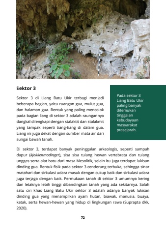 Pada sektor 3Liang Batu Ukirpaling banyakditemukantinggalankebudayaanmasyarakatprasejarah.Sektor 3 di Liang Batu Ukir terbagi menjadibeberapa bagian, yaitu ruangan gua, mulut gua,dan halaman gua. Bentuk yang paling mencolokpada bagian liang di sektor 3 adalah raungannyadangkal dilengkapi dengan stalaktit dan stalakmityang tampak seperti tiang-tiang di dalam gua.Liang ini juga dekat dengan sumber mata air darisungai bawah tanah.72Sektor 3Di sektor 3, terdapat banyak peninggalan arkeologis, seperti sampahdapur (kjokkenmodinger), sisa sisa tulang hewan vertebrata dan tulangunggas serta alat batu dari masa Mesolitik, selain itu juga terdapat lukisandinding gua. Bentuk fisik pada sektor 3 cenderung terbuka, sehingga sinarmatahari dan sirkulasi udara masuk dengan cukup baik dan sirkulasi udarajuga terjaga dengan baik. Permukaan tanah di sektor 3 umumnya keringdan letaknya lebih tinggi dibandingkan tanah yang ada sekitarnya. Salahsatu ciri khas Liang Batu Ukir sektor 3 adalah adanya banyak lukisandinding gua yang menampilkan ayam hutan, biawak, manusia, buaya,katak, serta hewan-hewan yang hidup di lingkungan rawa (Suprapta dkk,2020).