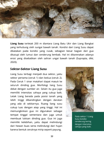 Pada sektor 1 LiangSusu kondisicenderung keringdengan intensitascahaya yang baik.Liang Susu terletak 200 m diantara Liang Batu Ukir dan Liang Bangkaiyang terhubung oleh sungai bawah tanah. Kondisi dari Liang Susu dapatdikatakan pada kondisi yang rusak, sebagian besar bagian dari guaditutupi oleh lumut dan cenderung lembab. Hal ini dikarenakan adanyaerosi yang disebabkan oleh saliran ungai bawah tanah (Suprapta, dkk;2020).77Liang Susu terbagi menjadi dua sektor, yaitusektor pertama (ceruk 1) dan kedua (ceruk 2).Pada Ceruk 1 sinar matahari dapat masuk keseluruh dinding gua. Morfologi liang Susudekat dengan sumber air. Selain itu gua jugamemiliki intensitas cahaya yang cukup baik.Letak Liang berada pada posisi tanah yanglebih tinggi dibandingkan dengan daratanyang ada di sekitarnya. Ruang liang susucukup luas dengan atap yang tinggi. Hal inimemungkinkan gua ini digunakan sebagaitempat tinggal sementara dan juga untukmembuat lukisan dinding gua. Gua ini jugamemiliki kelebihan, yaitu dapat melindungidari hewan buas serta melindungi dari hujankarena bentuk ceruknya mirip seperti payung.Sektor-Sektor Liang Susu