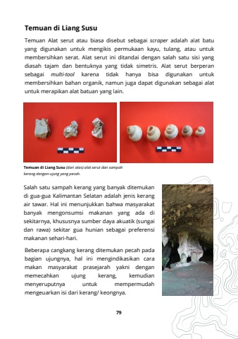 79Temuan di Liang SusuTemuan Alat serut atau biasa disebut sebagai scraper adalah alat batuyang digunakan untuk mengikis permukaan kayu, tulang, atau untukmembersihkan serat. Alat serut ini ditandai dengan salah satu sisi yangdiasah tajam dan bentuknya yang tidak simetris. Alat serut berperansebagai multi-tool karena tidak hanya bisa digunakan untukmembersihkan bahan organik, namun juga dapat digunakan sebagai alatuntuk merapikan alat batuan yang lain.Salah satu sampah kerang yang banyak ditemukandi gua-gua Kalimantan Selatan adalah jenis kerangair tawar. Hal ini menunjukkan bahwa masyarakatbanyak mengonsumsi makanan yang ada disekitarnya, khususnya sumber daya akuatik (sungaidan rawa) sekitar gua hunian sebagai preferensimakanan sehari-hari.Temuan di Liang Susu (dari atas) alat serut dan sampahkerang dengan ujung yang pecah.Beberapa cangkang kerang ditemukan pecah padabagian ujungnya, hal ini mengindikasikan caramakan masyarakat prasejarah yakni denganmemecahkan ujung kerang, kemudianmenyeruputnya untuk mempermudahmengeuarkan isi dari kerang/ keongnya.