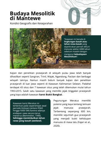 Budaya Mesolitikdi ManteweKondisi Geografis dan KesejarahanKajian dan penelitian prasejarah di wilayah pulau Jawa telah banyakdihasilkan seperti Sangiran, Trinil, Wajak, Ngandong, Pacitan dan berbagaiwilayah lainnya. Namun masih belum banyak kajian dan penelitianprasejarah di luar Jawa seperti di Kawasan Kalimantan Selatan. Padahalterdapat 43 situs dan 7 kawasan situs yang telah ditemukan mulai tahun1993-2015. Salah satu kawasan yang memiliki jejak tinggalan prasejarahyang kaya adalah kawasan karst Bukit Bangkai.%u201cKawasan ini berada dilingkungan basah ataulahan rawa basah yangdiperkirakan pernah dihunimanusia sekitar 6000 tahunsebelum masehi denganmenganut kebudayaanMesolitikum%u201d.Pegunungan Meratus memilikipotensi yang kaya tentang temuanjejak manusia prasejarah.Terbentang sepanjang 600 km,memiliki sejumlah gua prasejarahyang menjadi bukti kehidupanmanusia di masa lalu (Fajari et al.,2020).Kawasan karst Meratus initerbentuk pada seperempat awalperiode Holosen (antara 9560hingga 9300 SM) karena adanyaendapan rawa secara terusmenerus (Bemmelen, 1949).Sehingga menimbulkan lahanrawa yang basah (wetland).01