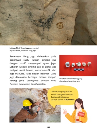 86Lukisan Motif Ayam Jago yang menjadiinspirasi dalam penamaan Liang Jago.Penamaan Liang Jago didasarkan padapenemuan suatu lukisan dinding guadengan motif menyerupai ayam jago.Sebaran lukisan dinding gua di Liang Jagomeliputi motif hewan, antropomorfik, danjuga manusia. Pada bagian halaman LiangJago ditemukan berbagai macam sampahkerang jenis Gastropoda dengan ordoTiaridae, Limmaidae, dan Pupinidae.Pecahan sampah kerang yangditemukan di area Liang Jago.Teknik yang digunakanuntuk mengetahui motiflukisan dinding guaadalah teknik %u201cCROPPING%u201d