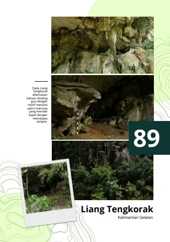 Liang TengkorakKalimantan Selatan89Pada LiangTengkorakditemukanlukisan dindinggua denganmotif menarikyakni manusiayang menaikikapal denganmembawasenjata.
