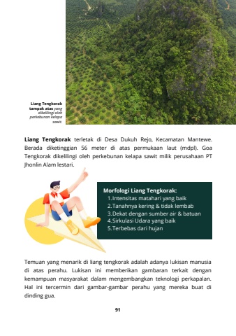 91Liang Tengkorak terletak di Desa Dukuh Rejo, Kecamatan Mantewe.Berada diketinggian 56 meter di atas permukaan laut (mdpl). GoaTengkorak dikelilingi oleh perkebunan kelapa sawit milik perusahaan PTJhonlin Alam lestari.Temuan yang menarik di liang tengkorak adalah adanya lukisan manusiadi atas perahu. Lukisan ini memberikan gambaran terkait dengankemampuan masyarakat dalam mengembangkan teknologi perkapalan.Hal ini tercermin dari gambar-gambar perahu yang mereka buat didinding gua.Morfologi Liang Tengkorak:1.Intensitas matahari yang baik2.Tanahnya kering & tidak lembab3.Dekat dengan sumber air & batuan4.Sirkulasi Udara yang baik5.Terbebas dari hujanLiang Tengkoraktampak atas yangdikelilingi olehperkebunan kelapasawit.